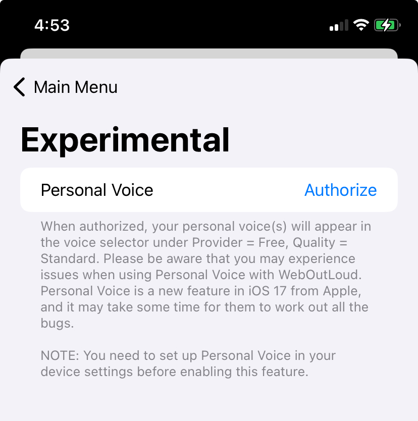In addition to the widget, WebOutLoud will be supporting iOS 17's new "Personal Voice". It's a feature where you can clone your voice and use it for text to speech not only with the new "Live Speech" feature but in apps as well. Your app simply needs to request permission to use the voice, and when granted it will show up among the other voices that are already available on the system. I tried it out with my own voice. The quality of the text to speech is ok, and it does sound like you. However, when I tried it in WebOutLoud, I noticed a couple of issues, first of all, it would simply skip some paragraphs of text for reasons unknown, and secondly, it appears to have a memory leak. I saw increasing memory consumption in my app the longer I listened with it. Anyway, I've put the new feature under a new "Experimental" section under the main menu.